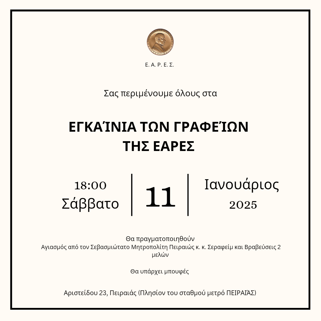 Η Ένωση Αποφοίτων ΕΑΡΕΣ σας προσκαλεί στα Εγκαίνια των νέων γραφείων της στον Πειραιά που θα πραγματοποιηθούν στις 11 Γενάρη 2025 στην οδό Αριστείδου 23 (5ος όροφος) πλησίον του σταθμού του μετρό της μπλε γραμμής ΠΕΙΡΑΙΑΣ.